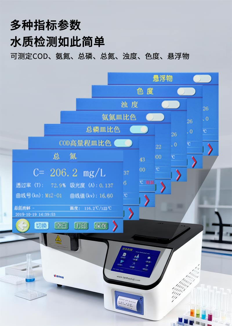 2.多光路無干擾系統(tǒng):具有多光路無干涉系統(tǒng),可測定COD、氨氮、總磷、總氮、濁度、色度、懸浮物。支持皿比色和管比色兩種比色方式;